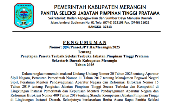 Bangko, kabarupdate.id — Proses seleksi terbuka Jabatan Pimpinan Tinggi Pratama Sekretaris Daerah (Sekda) Kabupaten Merangin memasuki babak akhir. Panitia Seleksi (Pansel) resmi mengumumkan tiga besar peserta terbaik yang berhak melaju sebagai kandidat utama Sekda Merangin Tahun 2025.