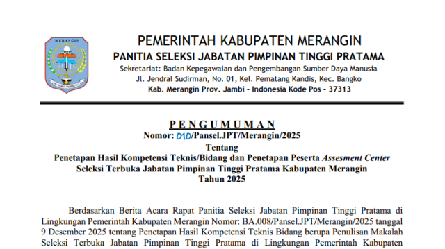Bangko, kabarupdate.id — Panitia Seleksi (Pansel) Jabatan Pimpinan Tinggi (JPT) Pratama Kabupaten Merangin secara resmi mengumumkan hasil Kompetensi Bidang Penulisan Makalah dan Wawancara Seleksi Terbuka JPT Pratama Tahun 2025. Pengumuman tersebut tertuang dalam Nomor: 010/Pansel.JPT/Merangin/2025 tertanggal 12 Desember 2025.