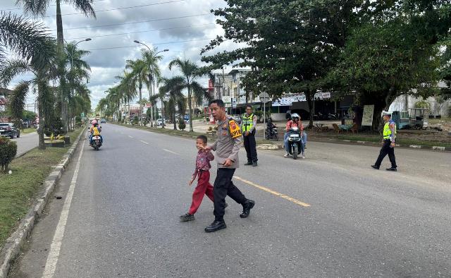 Momen kecil itu tak luput dari perhatian Kapolres Merangin AKBP Kiki Firmansyah Effendi. Tanpa aba-aba, ia menghentikan laju kendaraan dinasnya, turun, dan berjalan mendekati sang anak. Dengan gestur tenang, Kapolres menggenggam tangan si anak, memberi isyarat kepada pengendara untuk memperlambat kendaraan, lalu mendampinginya menyeberang hingga ke sisi jalan yang aman.