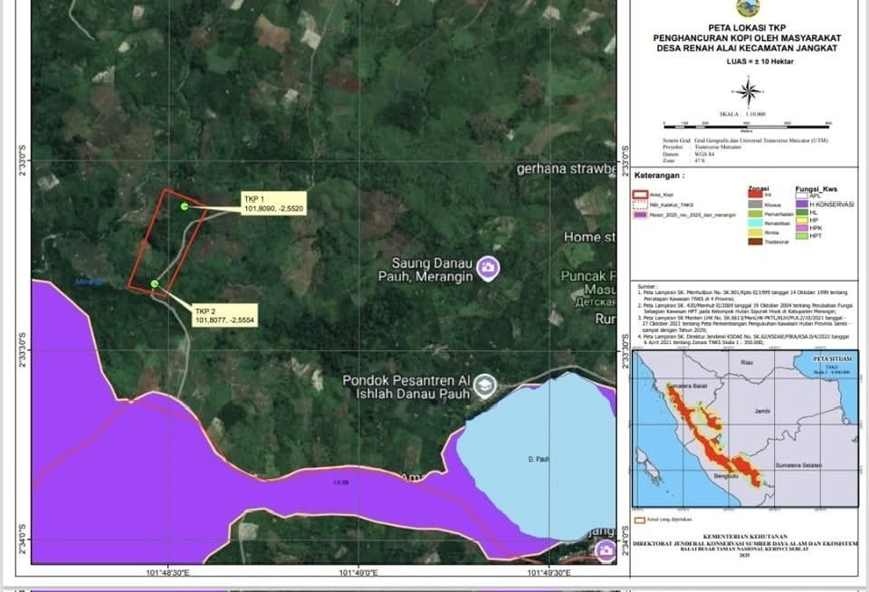 “Setelah kita kroscek di lapangan, ternyata TKP-nya di luar TNKS. Jadi posisinya di sekitar Sungai Gedang, Desa Renah Alai, dan masih ada sekitar 350 sampai 400 meter dari kawasan TNKS. Jadi dia Area Penggunaan Lain (APL), bukan di kawasan TNKS,” jelas Zainuddin, Rabu (29/10).